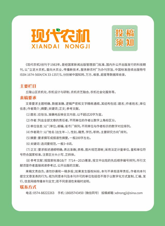 地址:浙江省宁波市钱湖南路8号浙江万里学院内 邮编:315100 国际刊号: ISSN 1674-5604 国内刊号: CN 33-1357/S 电话:(0574)88222263 88222472(传真) E-Mail:xdnongji@sina.com zjncjd@sina.com